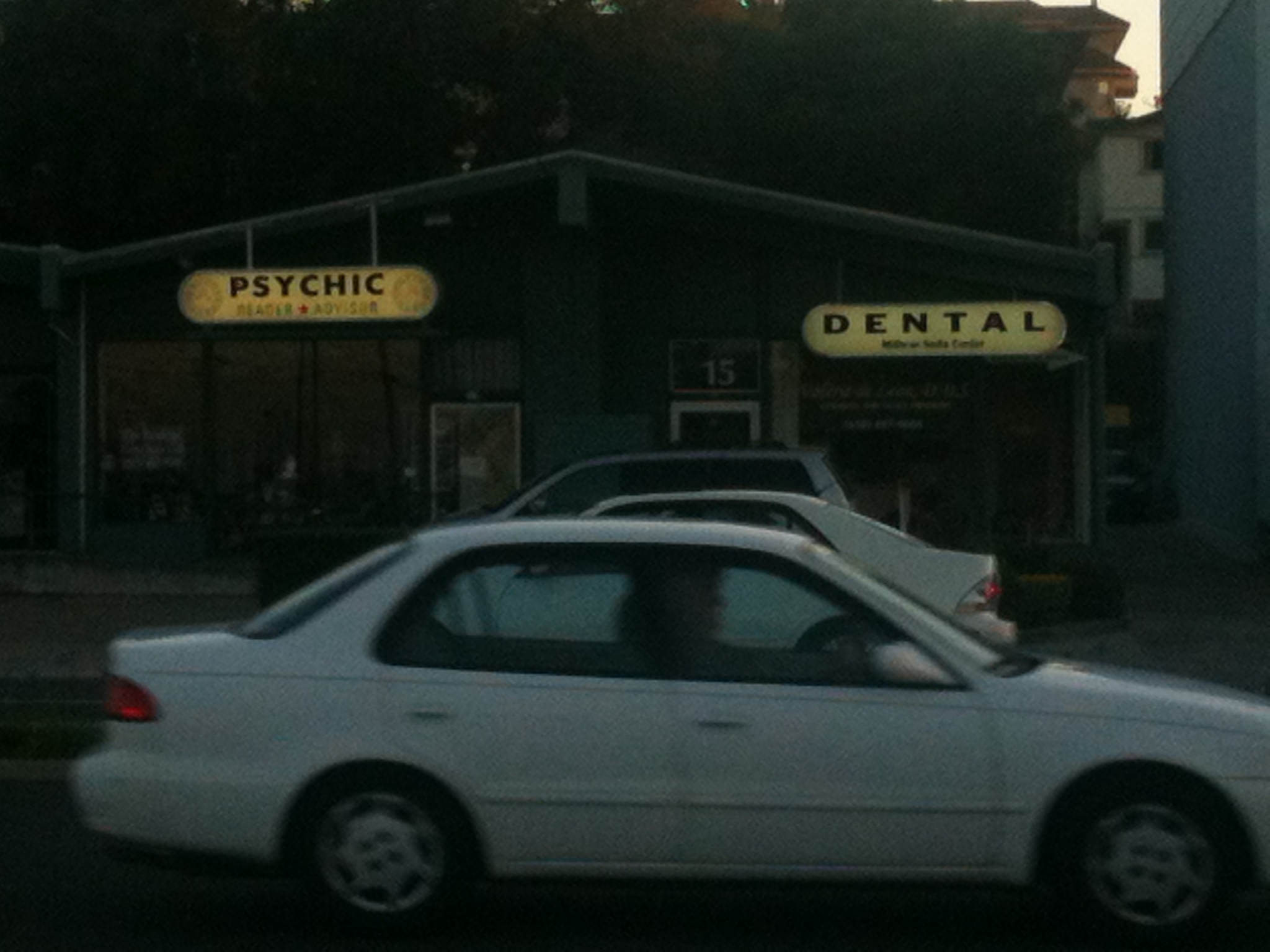 This one is near the airport in San Francisco. People fly into town from all over the world just for this place. A psychic dentist. No x-rays required. He can predict which of your teeth will get cavities. |